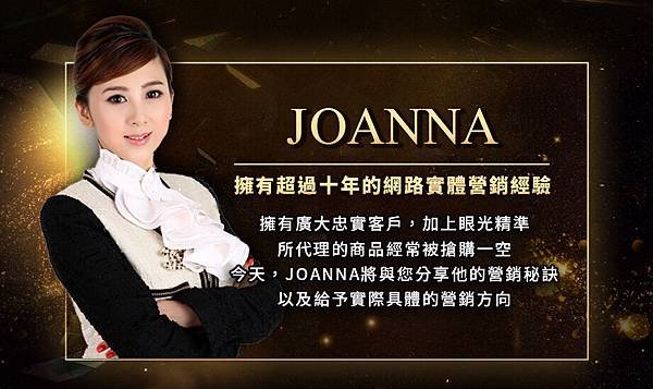 Joanna 擁有超過十年的網路實體營銷經驗,擁有廣大忠實客戶。加上眼光精準,所代理的商品經常被搶購一空。今天,Joanna將與您分享他的營銷秘訣以及給予實際具體的營銷方向。