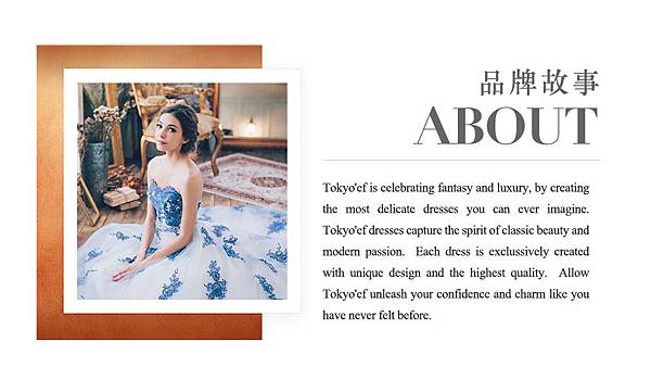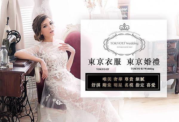 TOKYO Ef wedding 成立於2012年 延續 TOKYO Ef 獨家設計東方剪裁精神,強調簡約不繁瑣的設計風格,塑身效果強烈的曲線剪裁,並且有歐洲廠手工訂製的尊貴細膩,為新娘打造市場前所未有的獨特婚紗 並獲婚紗雜誌評選為北區六大名店