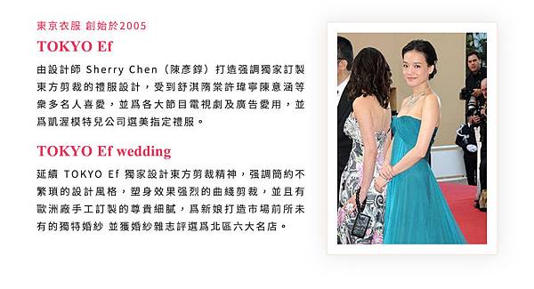 TOKYO Ef 成立於2005年 由設計師 Sherry Chen(陳彥錞)打造強調獨家訂製東方剪裁的禮服設計,受到舒淇隋棠許瑋甯陳意涵等眾多名人喜愛,並為各大節目電視劇及廣告愛用,並為凱渥模特兒公司選美指定禮服。